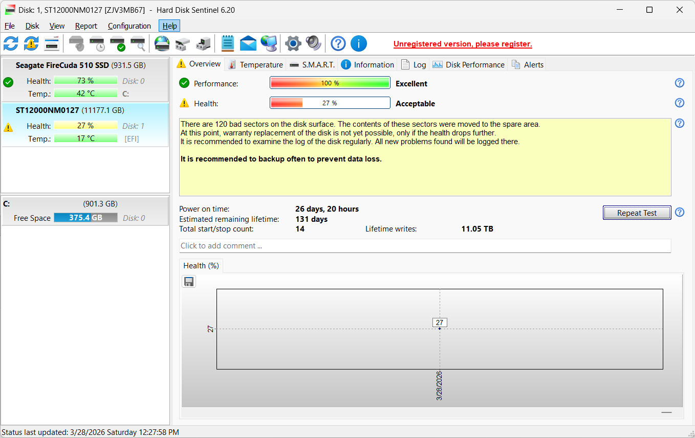 Eladó egy 12TB-os Seagate HDD ST12000NM0127 - nem zörög nem kattog, de a Hard Disk Sentinel szerinte 27% -os csak a health.