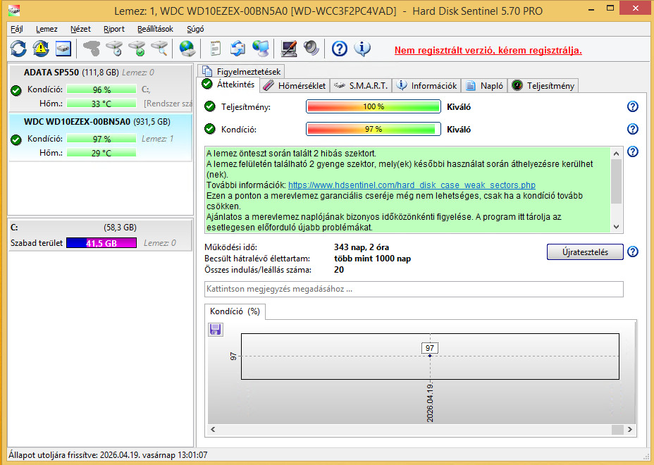 WD Blue WD10EZEX 97% 343 nap - 6000 Ft