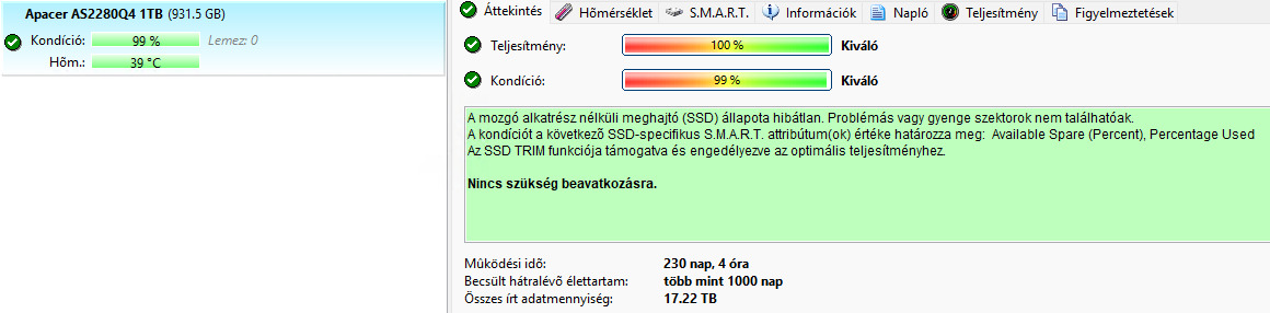 Apacer AS2280Q4X 1TB 99% 17TB 40eFt 2027.10.31. Samsung SSD 970 EVO Plus 1TB 100% 7TB 35eFt 1 hét