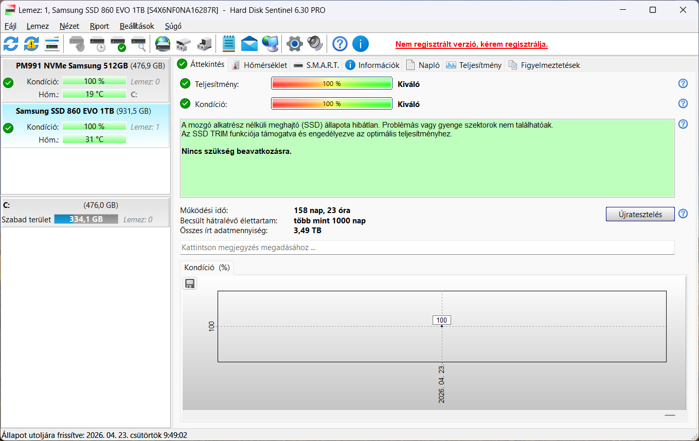 Összes írt adat: csak 3,49TB, 158 nap működési idő.