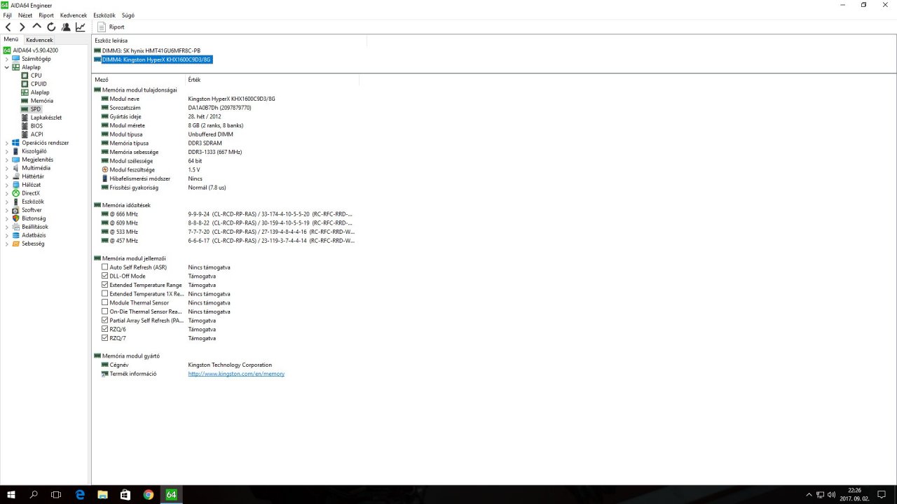 Aida szerint: Kingstone HiperX KHX 1600C9D3/8G, de mint alant látható 1333-as memória!