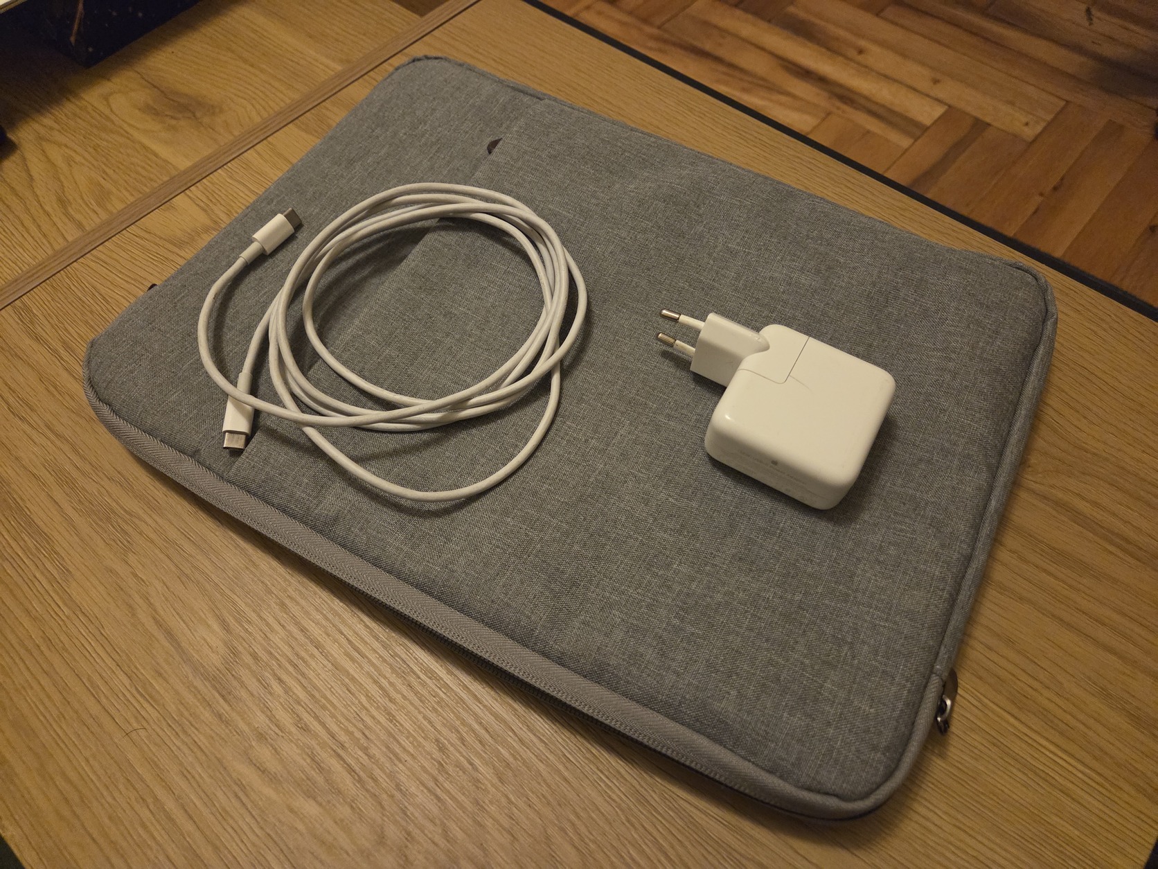 Apple 30W-os töltőfejjel, kábellel, illetve egy szürke hordtáskával egyben.
