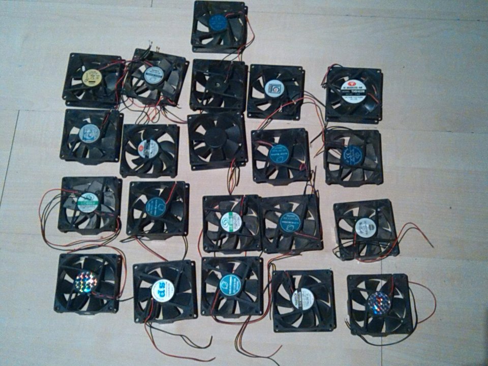 Elvihető 23 db (2 lemaradt a képről) 8 cm-es ventilátor, mind ATX tápból lettek kibontva. Egybe elvihető az egész egy 1,25-ös Fanta Narancért..