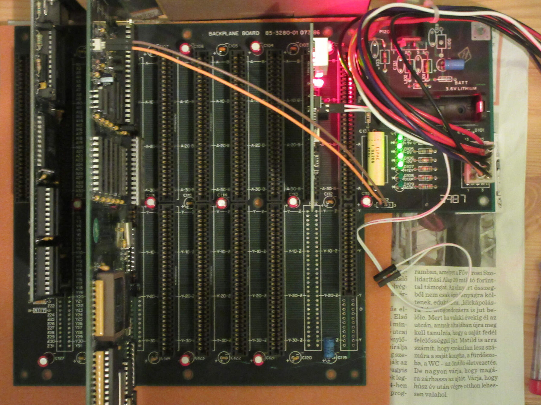 Igény esetén van egy ritka és szép "alaplap" is, aminek beüzemelése különleges tápcsatlakozója miatt egy kis ügyességgel oldható meg, viszont segítségünkre vannak a tápfeszültség jelző LED-ek. (ATX táp krimpek kiszedve pont rámennek.)