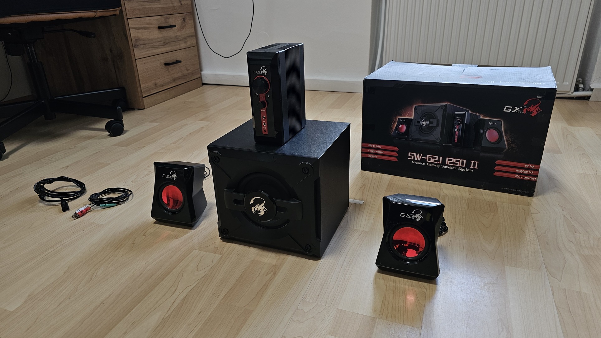 Doboz, használati útmutató, hangszórók, fejetség és a kábelek mind megvannak