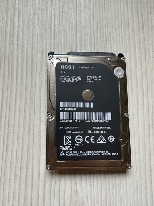 1TB HGST 2.5" SATA HDD, sentinel csatolva.