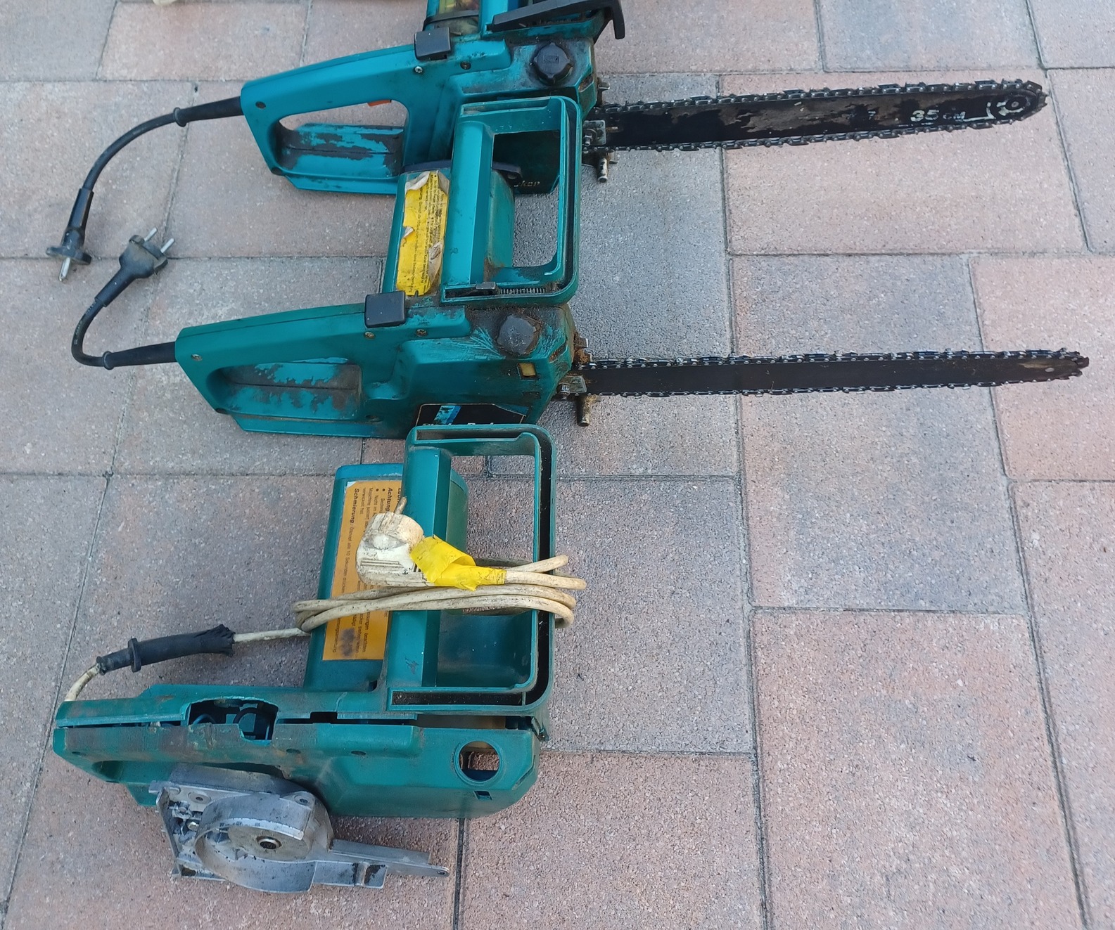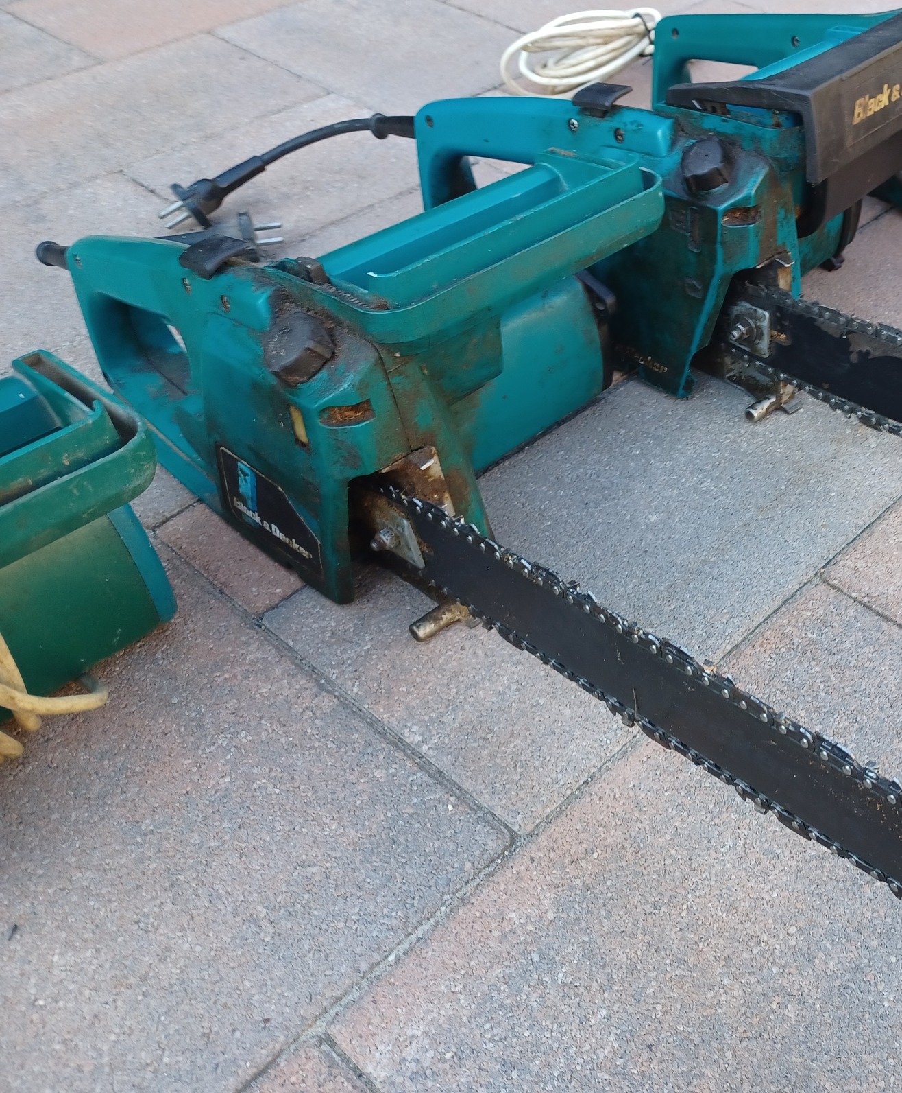 Eladó a képeken látható 2 db elektromos láncfűrész. Az ár tartalmaz egy harmadikat is tartalék alkatrésznek, abban benne van a két működőhöz passzoló villanymotor is. Komolyabb használat előtt némi karbantartást javaslok (pl. az egyiknek repedt a burkolata, a másiknak az indító gombja nem mindig reagál), de ettől függetlenül is működnek és azonnal használhatók. Ezek még a 80-as évek közepi gyártású minőségi Black & Decker láncfűrészek, Made in England, Made in France.