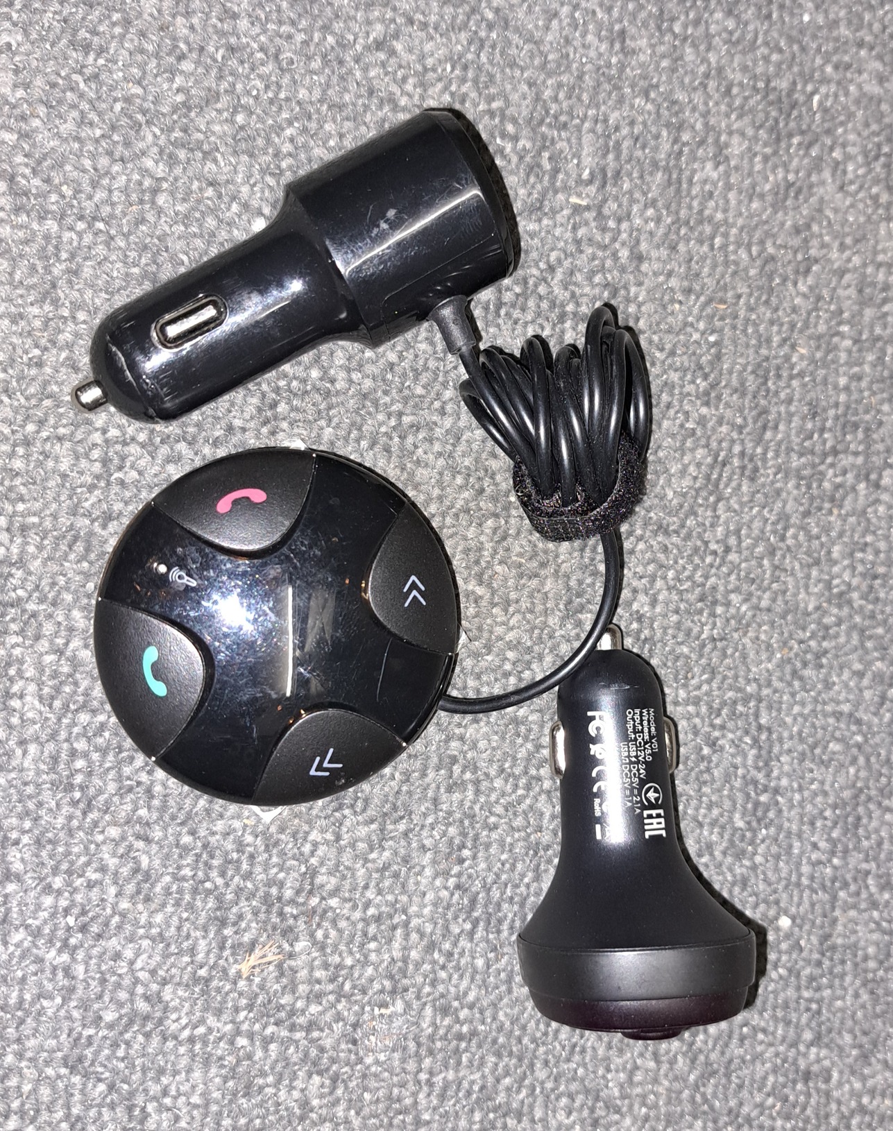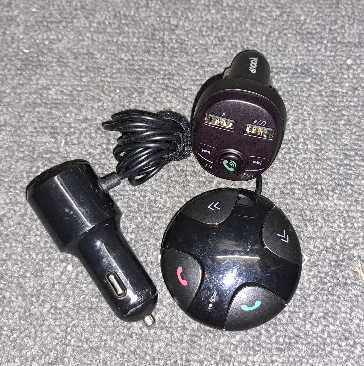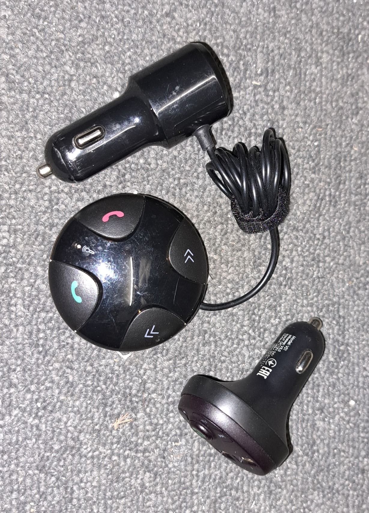 Eladó a képeken látható 2 db FM transmitter és bluetooth kihangosító egyben.
