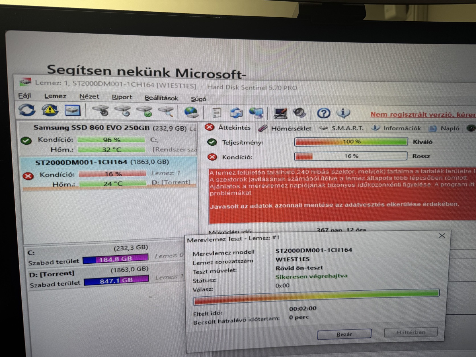 2TB - Gép látja, rövid önteszt lefut, használatban volt egy ideig így is de már csak porosodik