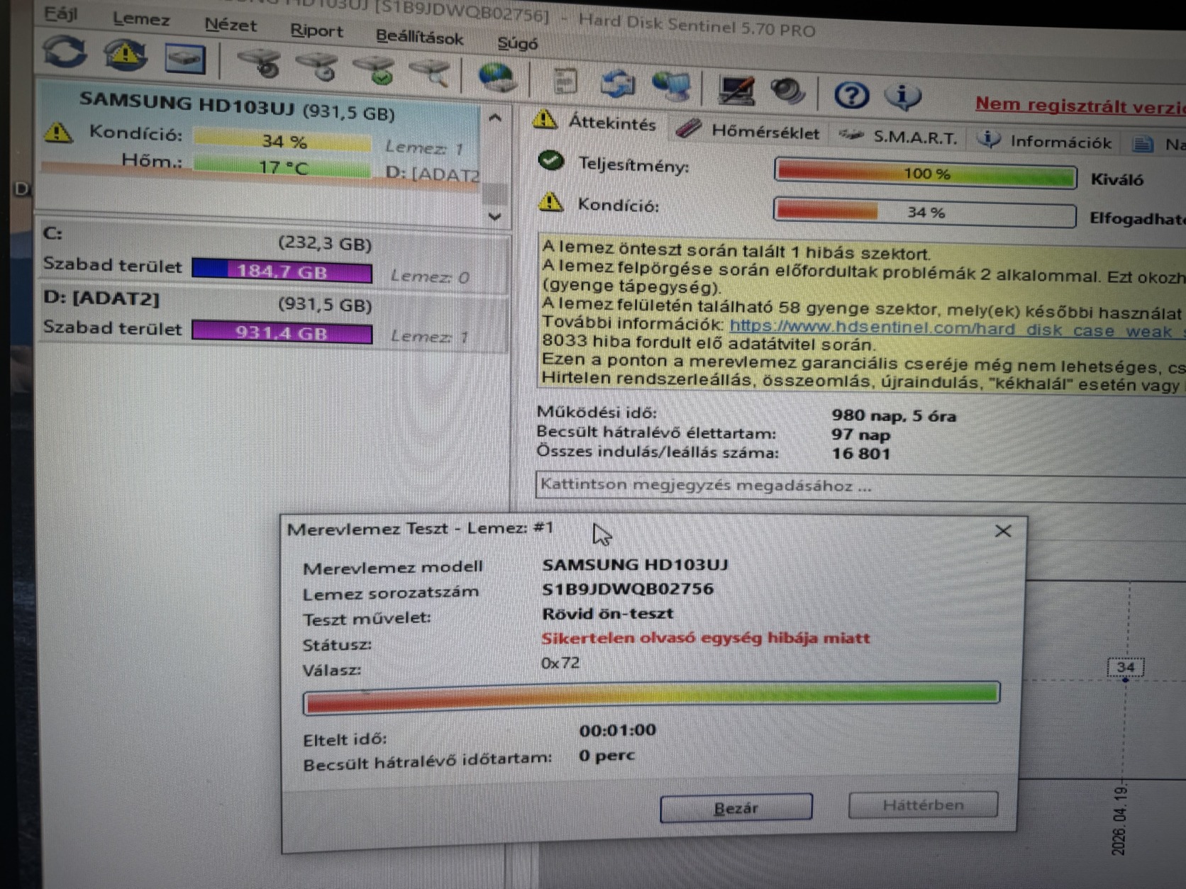 1TB - Gép látja, hangos, rövid önteszt nem fut le