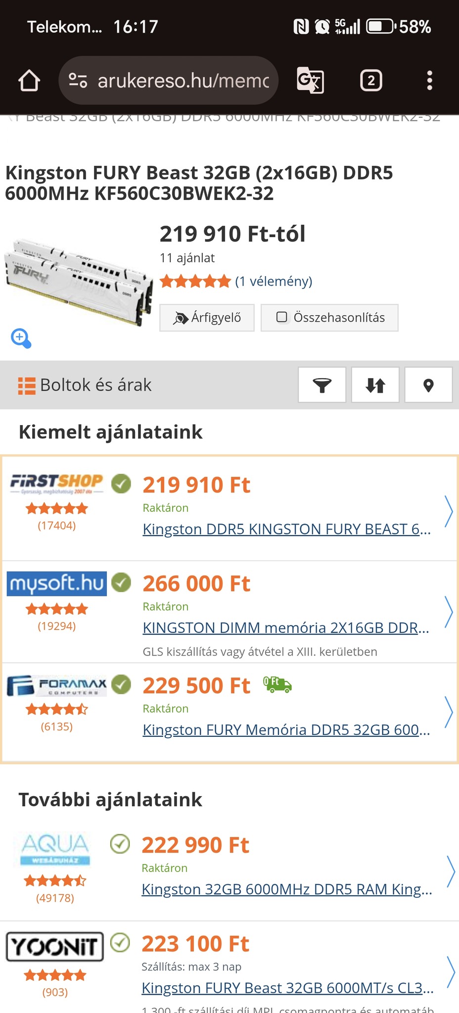Egy garnitúra.2x16 kingston fehér cl30 6000 új nem igen lesz több!!