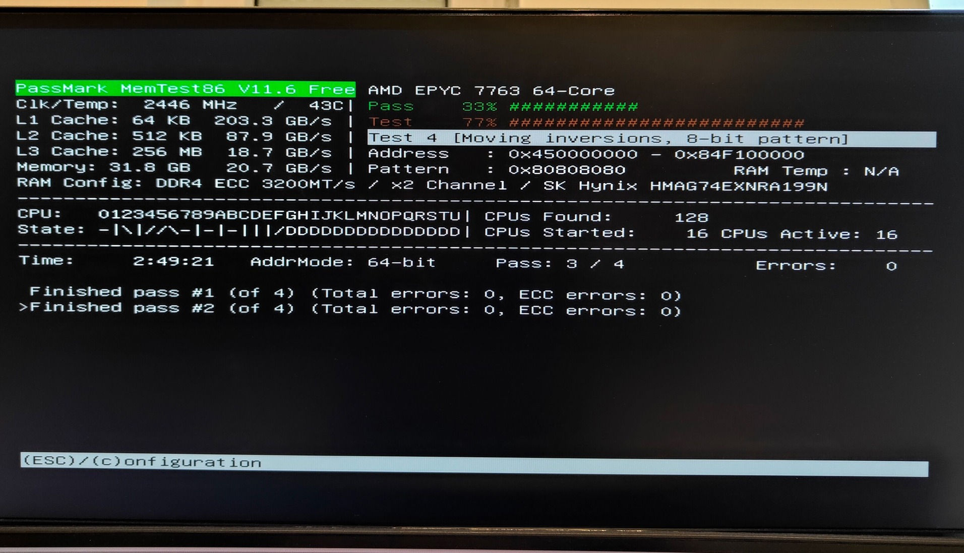 Futtattam közel 3 órán át memtestet, 2 teljes pass alatt semmi hibát nem kaptam (még ECC hibát sem), ld. screenshot.