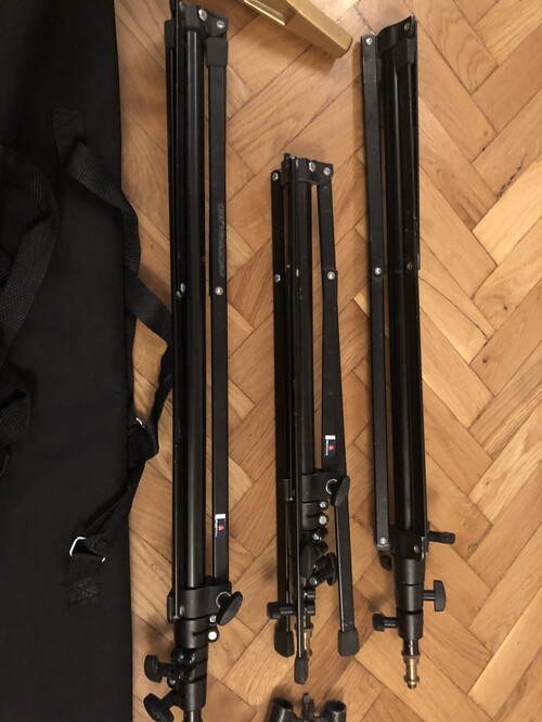 2db 240cm, 1db 2m manfrotto spigot állvány, 3db bélelt táska 85cm a belső szélessége, 1 spigot-ra rögzíthető erős szorítású csipesz amivel derítőt meg sokmindent meg lehet fogatni. 3db átalakító.
