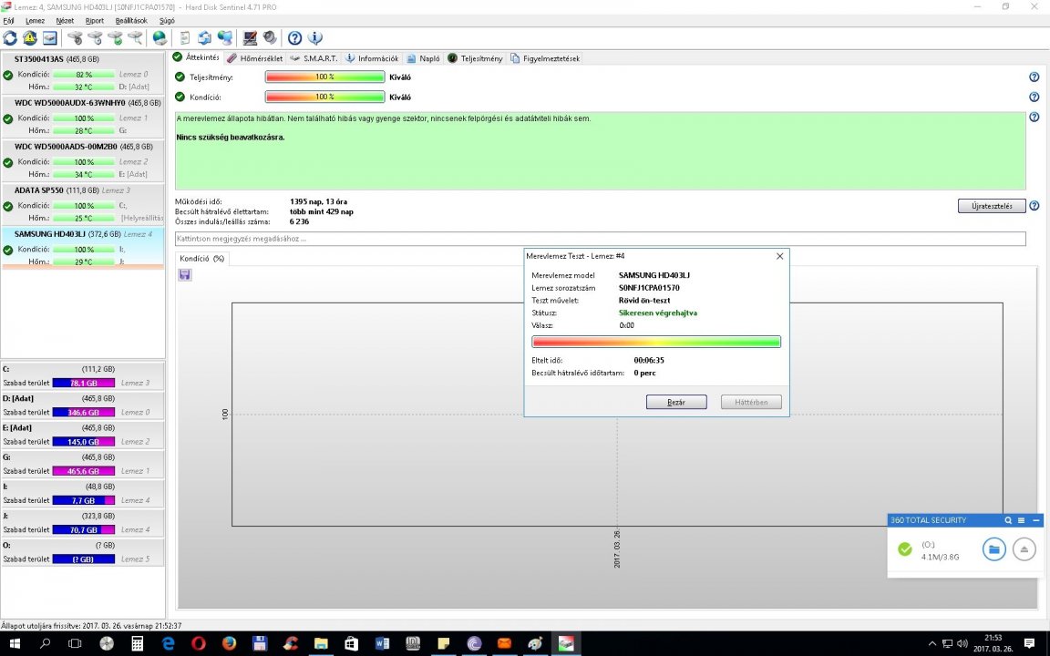 Hard Disk Sentinel eredmény: Teljesítmény100%, illetve a kondíció is100%.