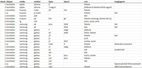 Többféle (főleg Samsung, Huawei, Iphone és LG) telefontok, a legtöbb bontatlan csomagolásban, a többi pedig szintén új, használva sosem volt. A táblázatban szerepel a részletes lista.