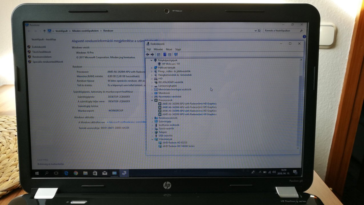 Eladó a képeken látható HP Pavilion g6 notebook 4 magos processzorral, 2 videókártyával, Windows 10-el frissen telepítve. Az akkumulátor már gyenge (cserélhető akkus), kb. 20-30 percet bír, de a gyári töltője jár hozzá. A gyári HDD kerete nincs meg. Az ár FIX, csere nem érdekel!