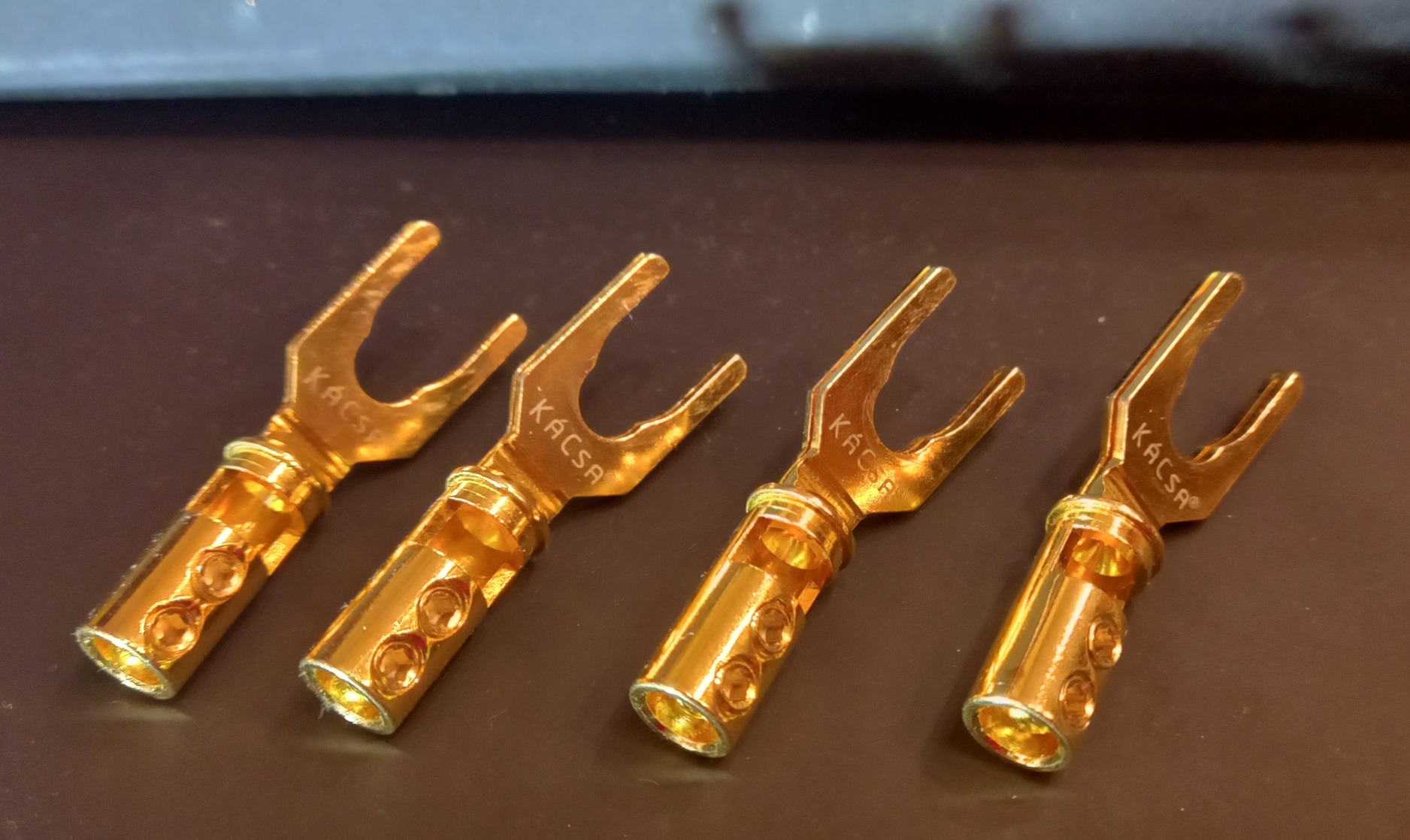 4db professzionális High End hangfal villa, aranyozott. Különleges rugó funkciója a villa 2 rétegének összenyomásával működik. Tömör bronzból készített. 8 mm2 hangfalkábel méretig forrasztással vagy csavarozással rögzíthető. A villa nyílása 8,6/13 mm, a legtöbb banán aljzathoz passzol. A kábelfogadó hüvely belső átmérője 5,5 mm.
