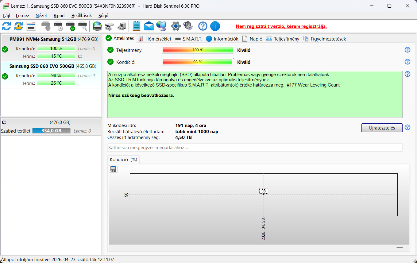 Összes írt adat: 4,5TB, 191 nap működési idő.