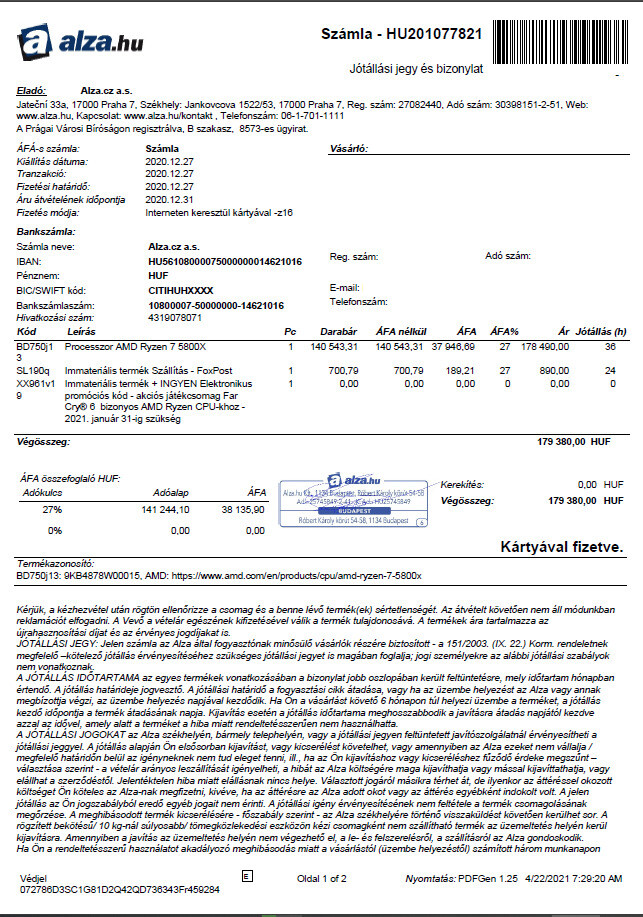 Eladó fent nevezett, hibátlan processzor, dobozában, 2023.12.27-ig garival, ami az ALZA-hoz szól