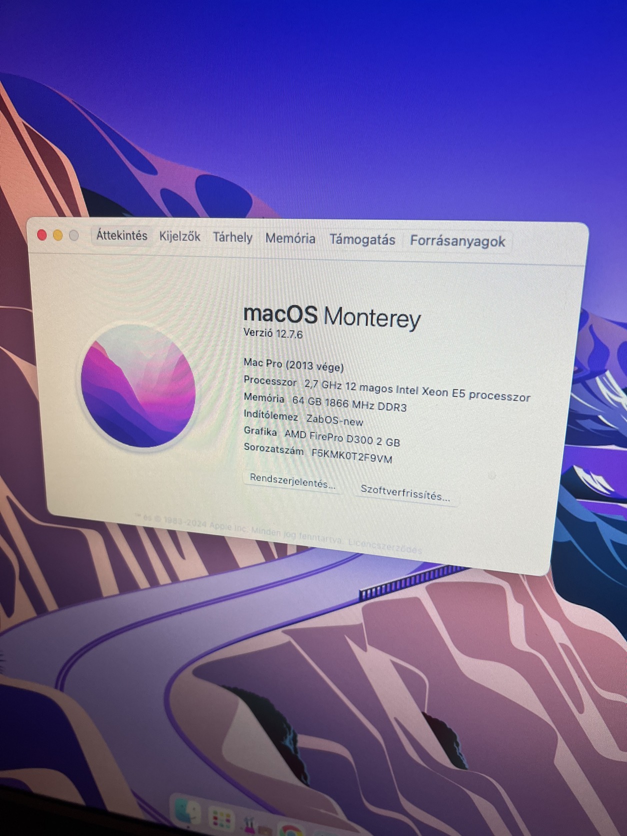 Eladó egy 2013-as Mac Pro a következő specifikációkkal, használt állapotban kis kopásokkal: