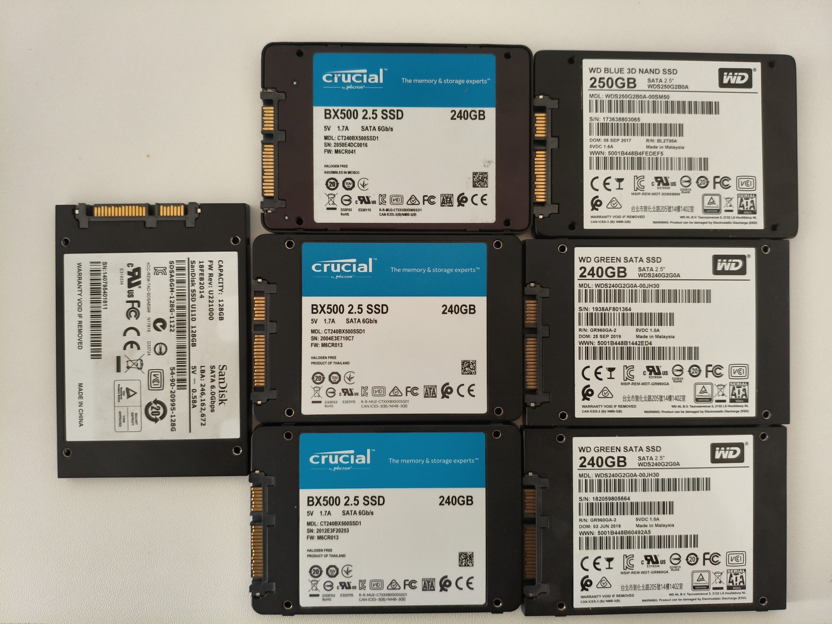 1 db Western Digital Blue 3D NAND (250 GB) 3 db Crucial BX500 (240 GB) 2 db Western Digital Green (240 GB)