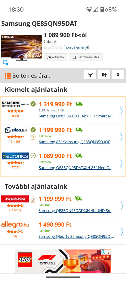 Eladó 85" Samsung QE85QN95D Samsung oldaláról rendelt még 2.5 év garanciával 6 hónapos a tv hibátlan újszerű állapotban eladó,eladás oka Samsung QE98QN90f vásároltam. 650.000 forint az ára.