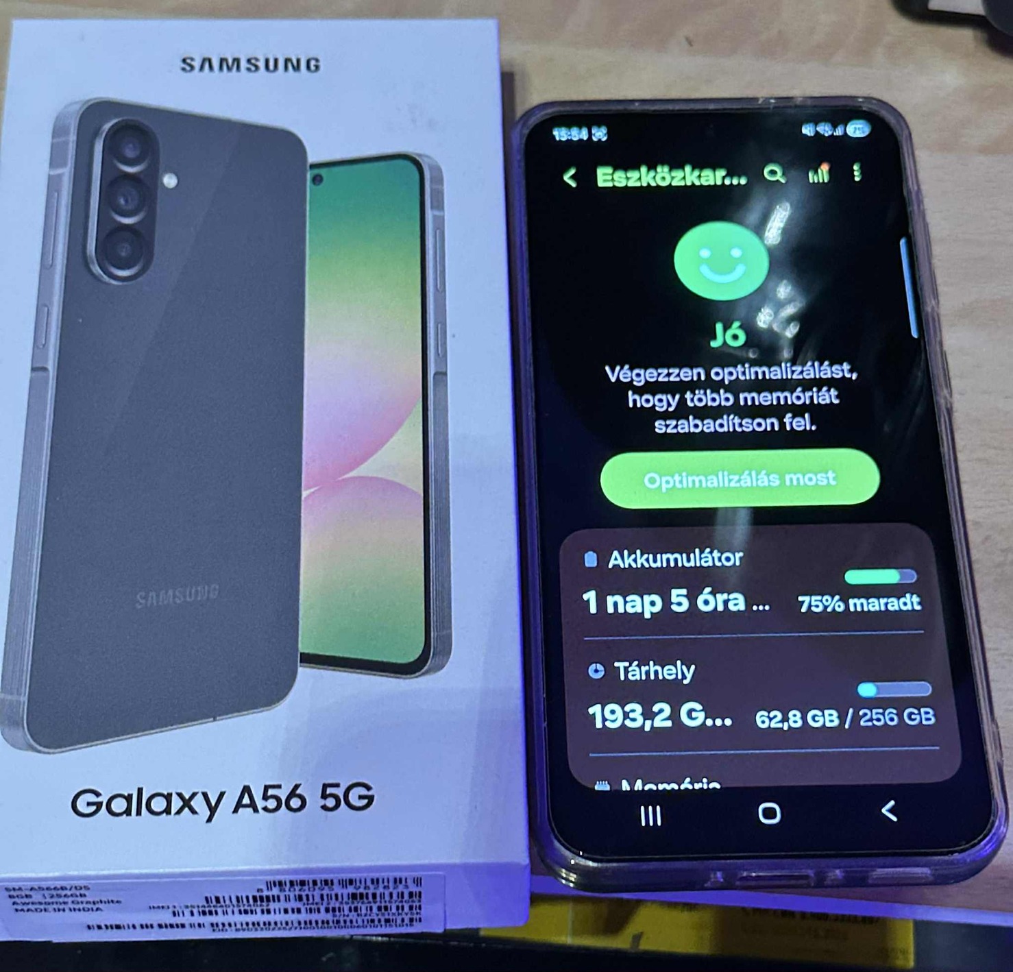 Eladó egy szürke Samsung A56 8/256 gigás, makulátlan állapotban, dobozában, tokkal, számlával, garanciával ami a Telekomhoz szól. A készülék kb 3 hónapos fóliával és tokkal védve.