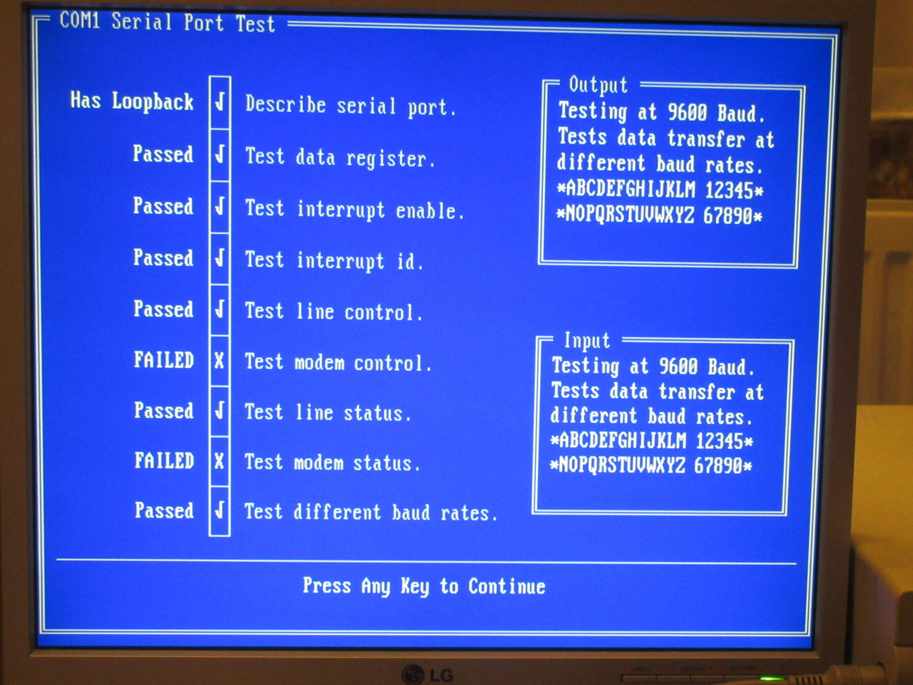 COM1 teszt: Checkit és Pin 2-3 external loopback: [kép]