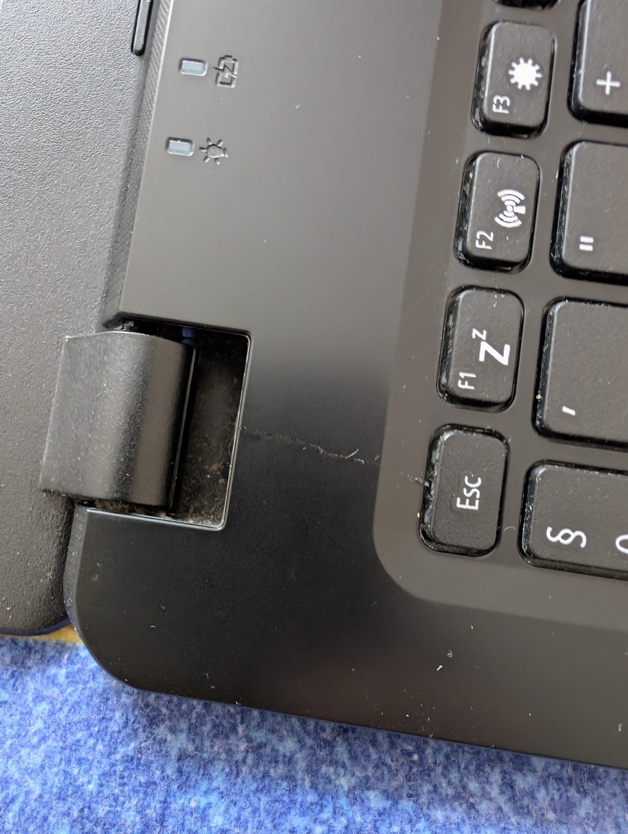 A laptop hibás, bekapcsoló gombra nem reagál - más gomb folytonos nyomásával bekapcsol. A bal oldali zsanérnál repedés, fényképzeve.