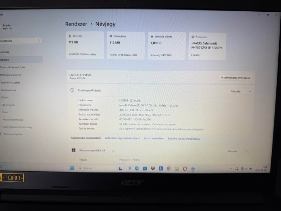 Pár hónapos Acer aspire 3 a315-34 laptop,gyári Windows 11-el feltelepítve eladó. Kiválóan működik,akku 100%-os. Iskolakezdéshez,filmnézéshez,kissebb játékokhoz vagy bármi egyéb dologhoz kiválóan alkalmas,könnyű súlya miatt nagyon praktikus hordozni.Töltő,tartozéka, tulajdonságai a képek között megtalálható.Apró karcolások találhatók a fedlapon,nyilván szállításból adódóan, használatát nem befolyásolja. Egy matricával orvosolható. Alku oké,csere nem!