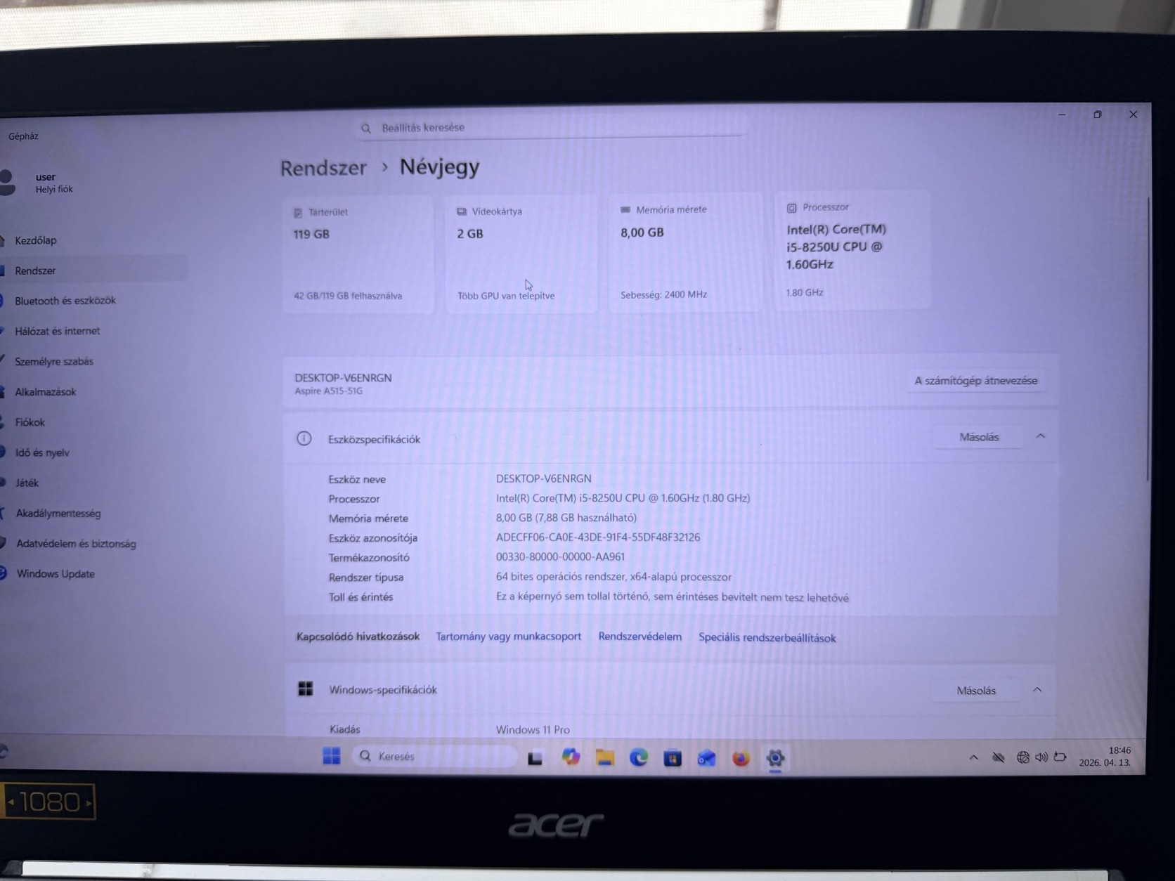 15,6" FHD 1920 x 1080 IPS kijelző