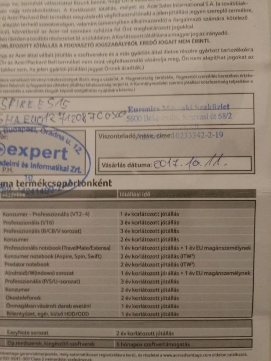 A gép 2018. 10. 11.ig garanciás,s mivel acer így háztól házig hozzák ,s viszik,tehát nem kell sehová vinni,de jelenleg is hibátlan. Gyári doboza,s minden kelléke megvan,töltő,csomagolás,driver lemez win10 hez. A gyárilag 500 as merevlemez volt benne,de jelenleg is egy garanciás ssd vel adom, aminek a garanciáztatásában tudok segíteni ha úgy alakulna 2020.12.08 ig garis.