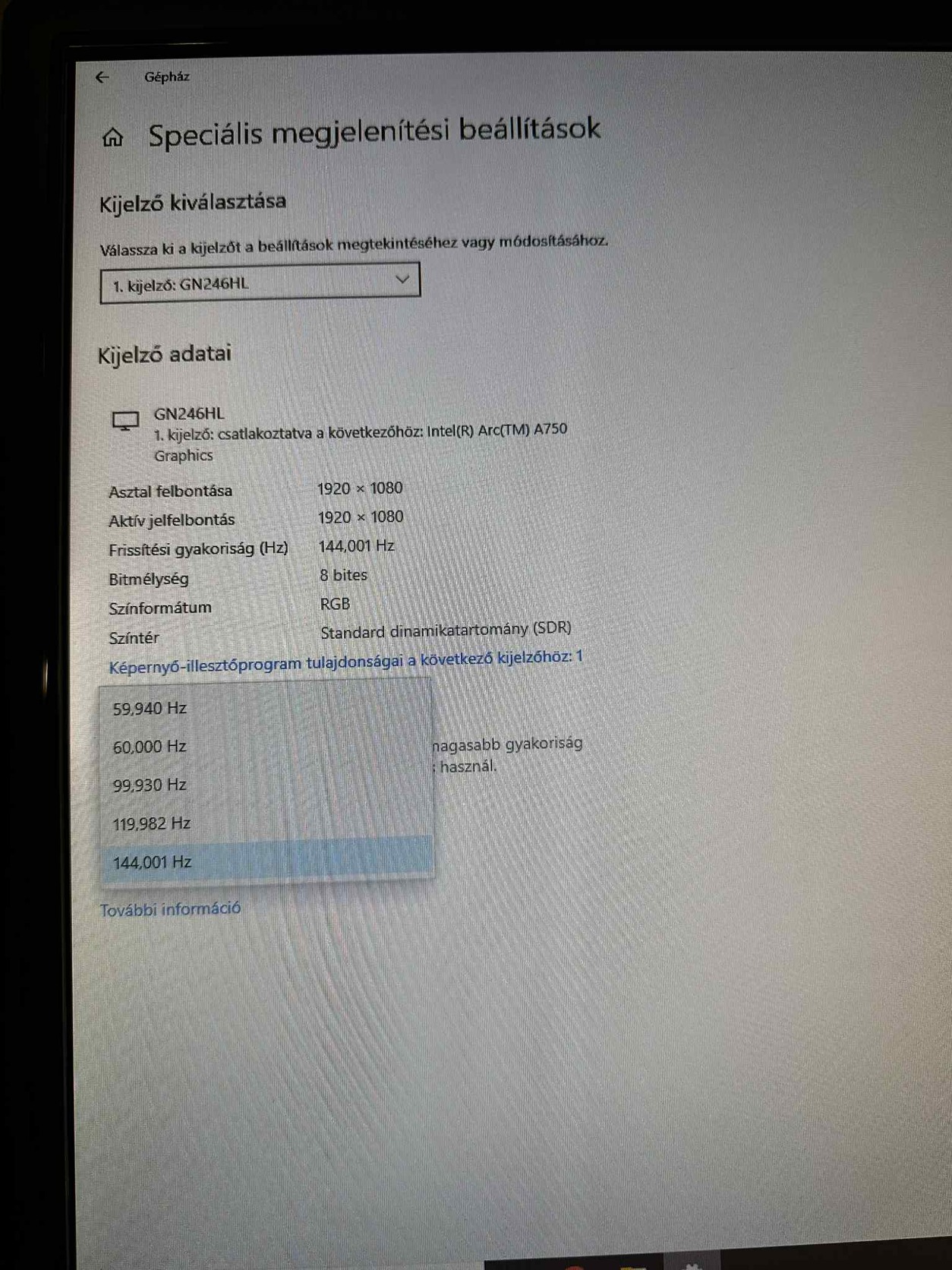 Képfrissítési frekvencia: 144Hz