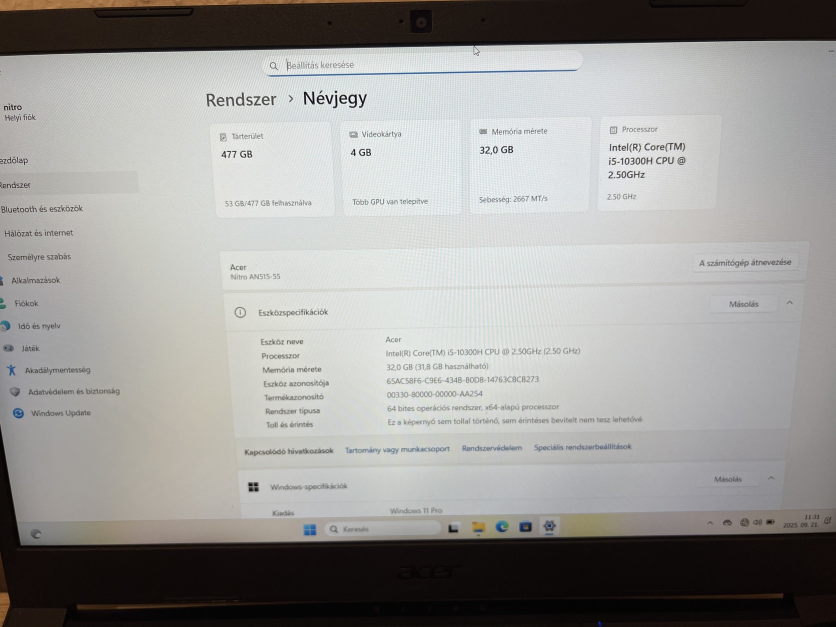 Acer Nitro 5 AN515-55-591Q NH.QB0EU.001 Notebook szép állapotban eladó! Doboza, töltője meg van és jár hozzá egy hűtő is!