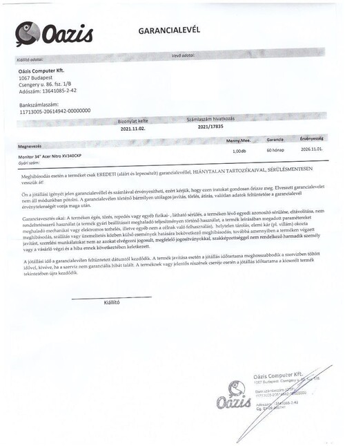 Garancia: 2026.11.01 ig garanciális az Oázisba.