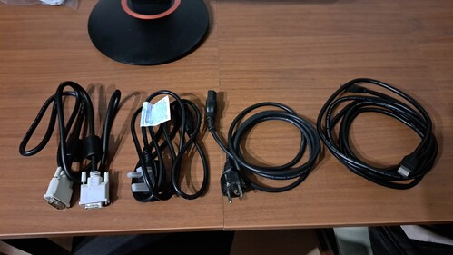 A képen látható kábelek járnak hozzá (HDMI, DVI-D, és a két áramkábel, az egyik angol fejjel).