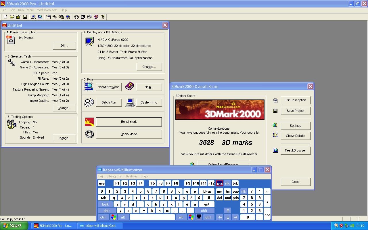 Windows XP feltelepült, és egy VGA-n lefutott többször egy 3DMark 2000 teszt.