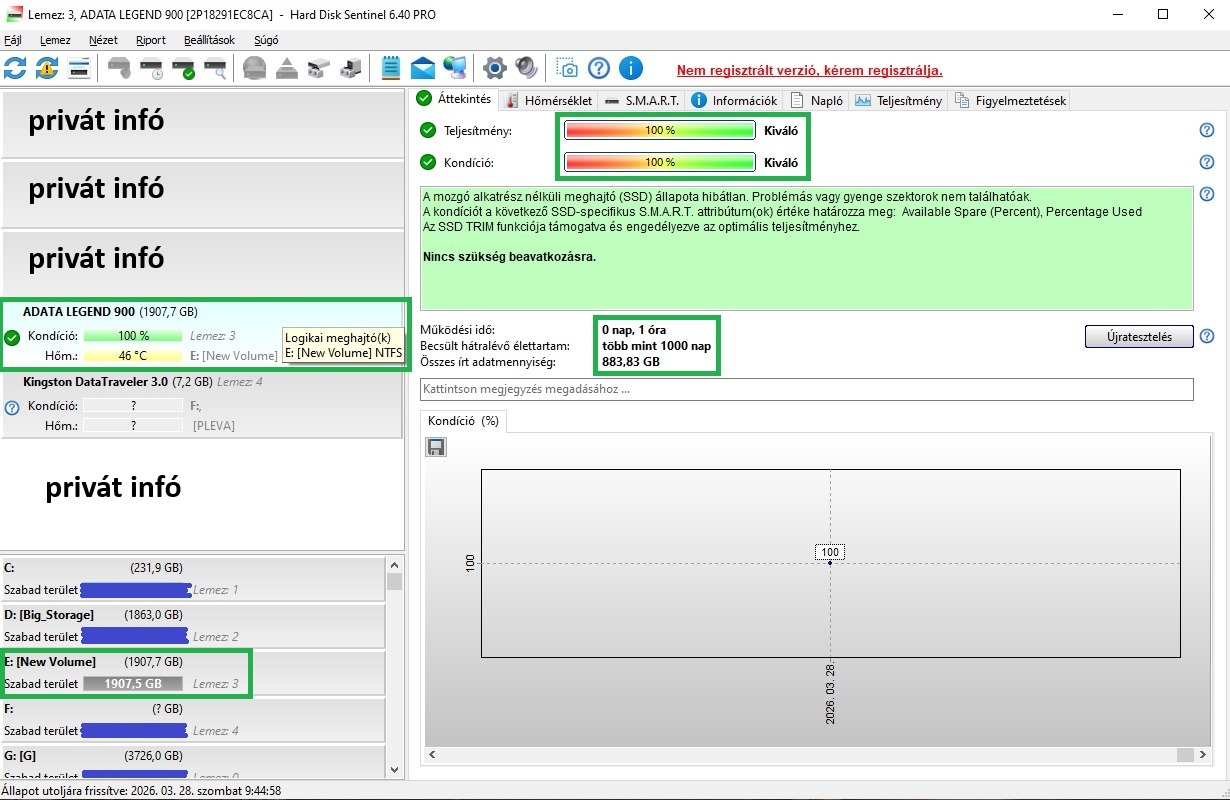 Gyakorlatilag 0 km van benne ( 833 GB és 1 óra üzemidő, amíg le lett tesztelve. )