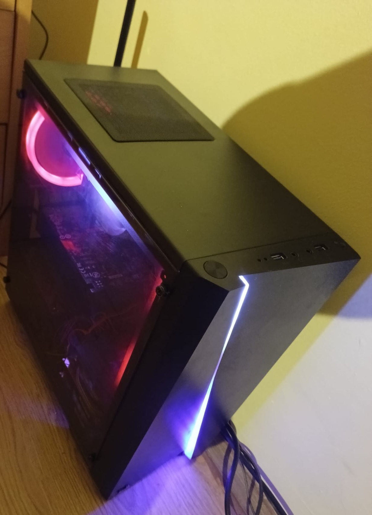 Eladó RGB gépház. A képeken látható állapotban, van egy kis hibája azt fotóztam. Micro ATX, Mini ITX méret, átlátszó plexi oldal lappal. Elég jól szellőző a ház, az elején van egy usb 3.0, egy usb 2.0 valamint egy Jack és mikrofon port is. Ott helyezkedik el egy gomb is amivel lehet váltogatni az RGB-t, többféle színben, többféle mintában vagy többféle gyorsaságban. Méretei: 18,6 x 38,1 x 37,3 cm.