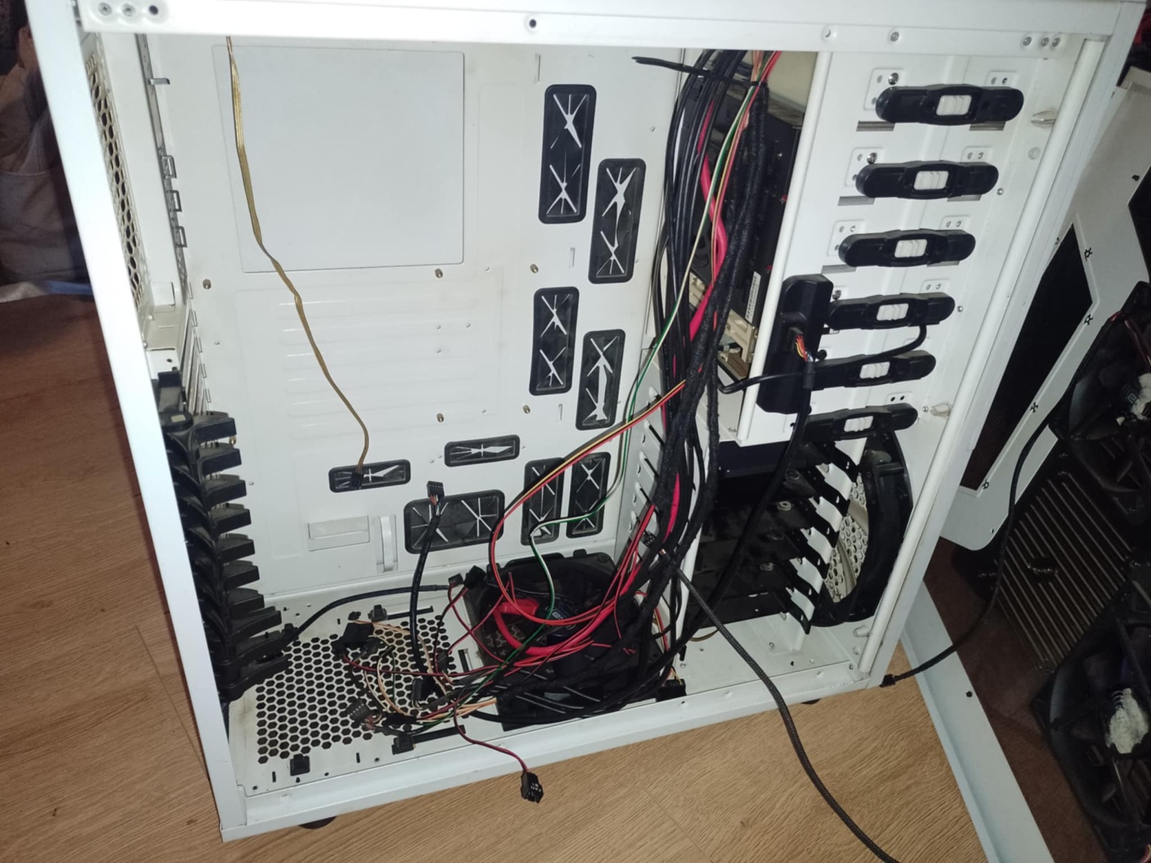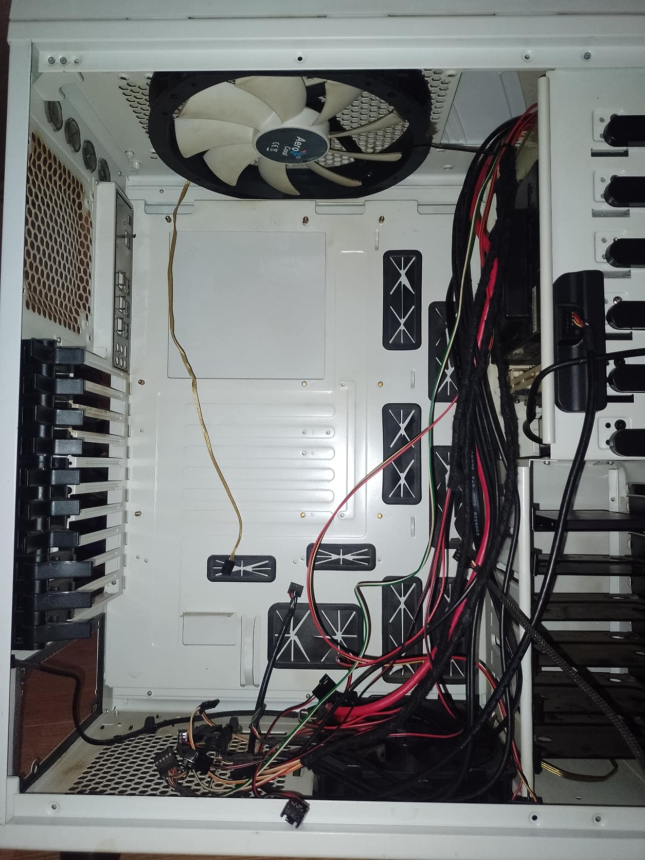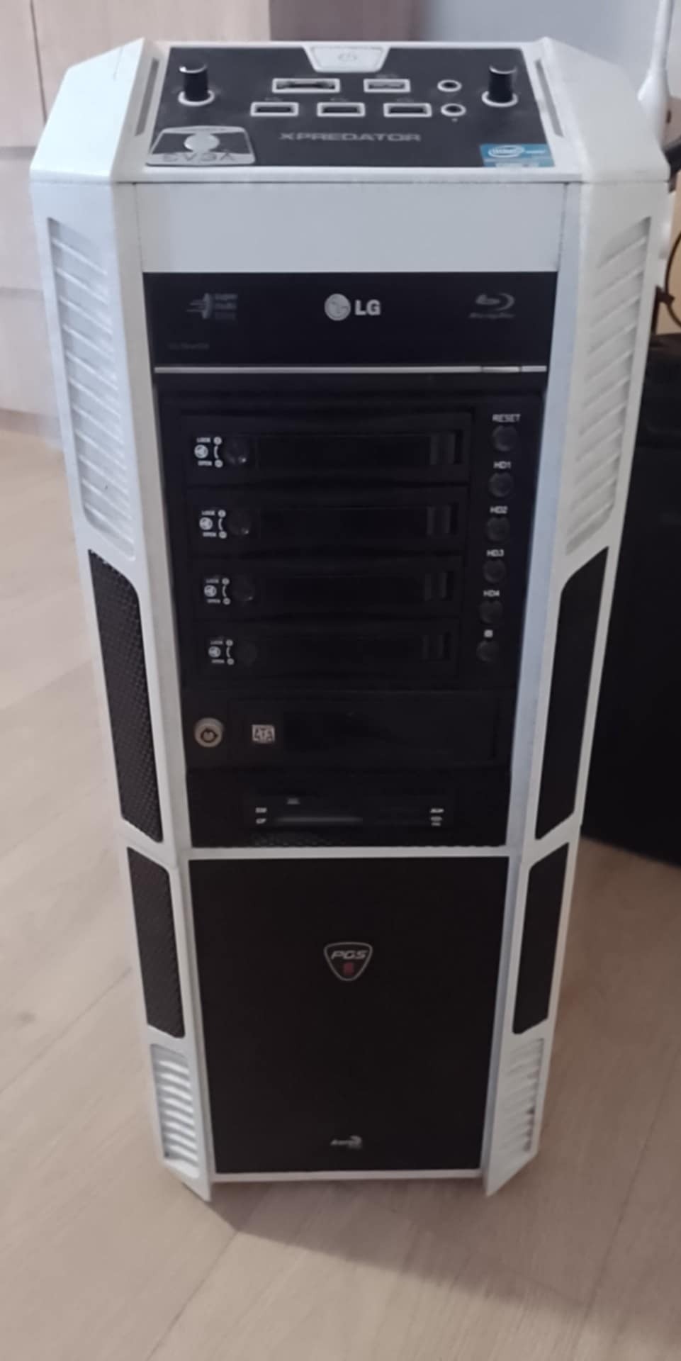 Nem eredeti gyári verzió,mert 5 mobilrack van benne,illetve egy floopy és kártyaolvasó.Így üresen is van súlya,nem az olcsó műanyag kategória.A hűtőventillátorok nem világítósak,nem zenélnek,egyszerűen csak teszik a dolgukat egy megfelelő táp behelyezése után,hűtenek.
