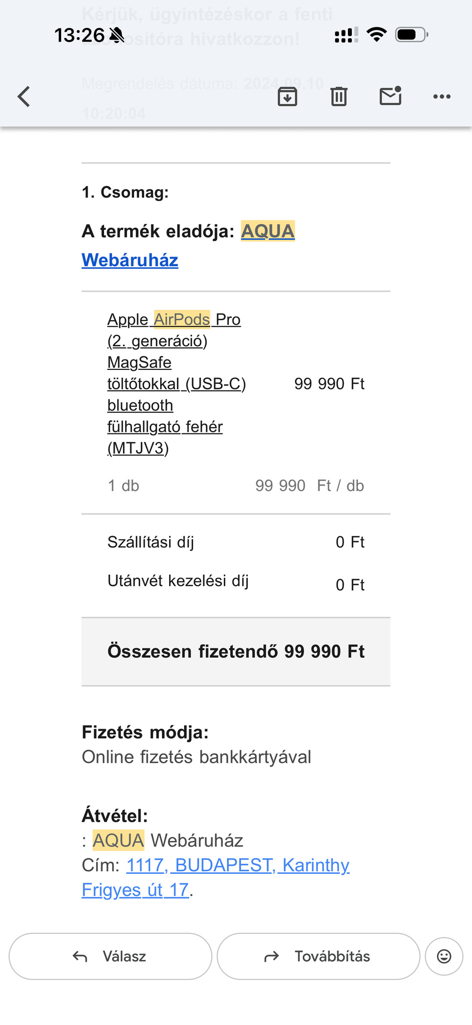Apple garancia már lejárt. 2024. szept 10-ei vásárlás.