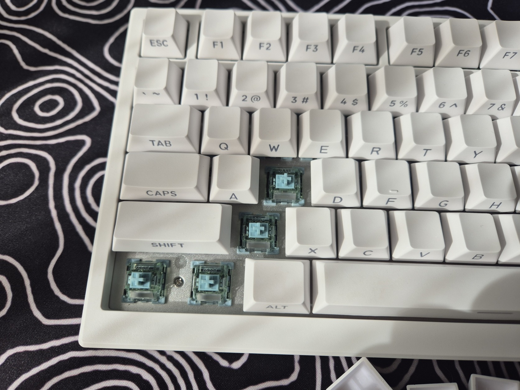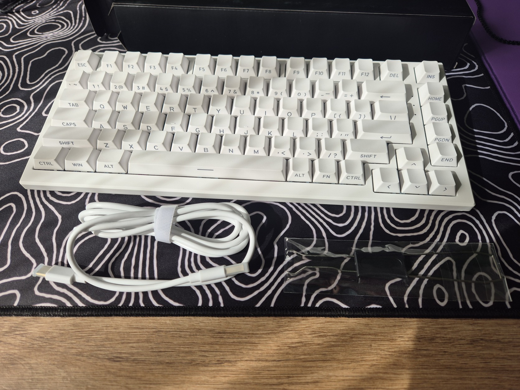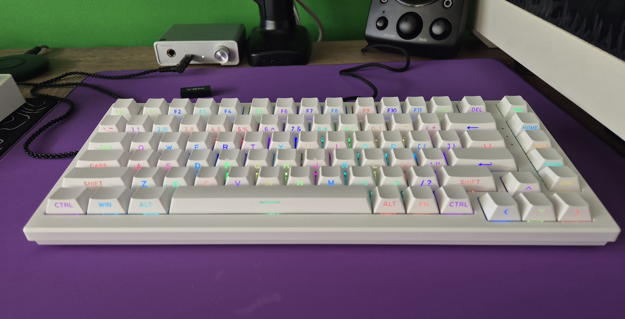 75%-os kiosztású és ahogy a képeken is látszik a keycapeken oldalt vannak a betűk.