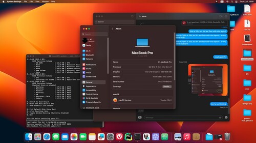 Natívan futtatja a macOS-t Opencore-on keresztül (tesztelve Monterey, Ventura, Sonoma). Minden működik: wifi, bluetooth, gesztusok, alvó mód.