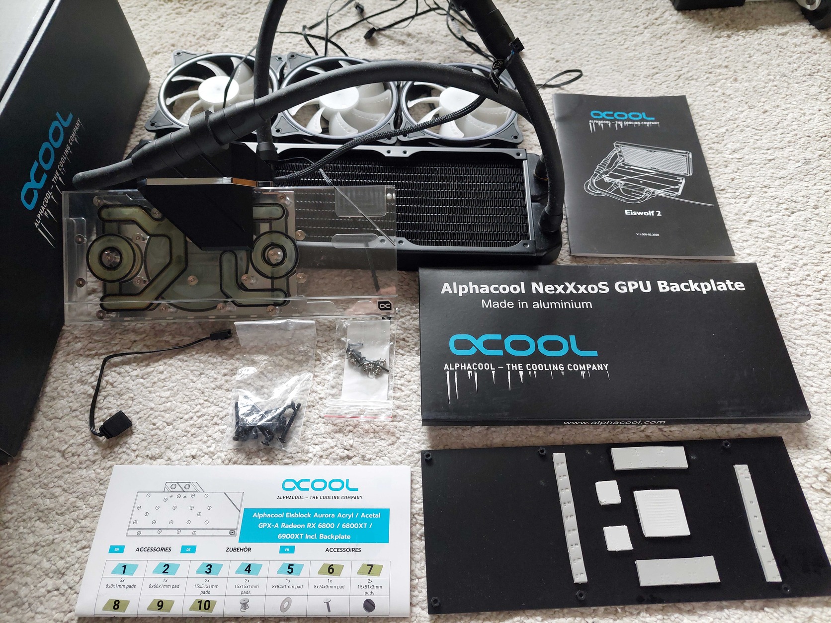 Eladó Alphacool Eiswolf 2 AIO 6800/6900XT/6900 Reference Design+Backplate komplett vízhűtés. Nagy 360mm réz radiator, minőségi 3db rgb fan, -20C fok a gyári hűtéshez képest, extra hátsó alu hűtőlap, hibátlan , minden tartozékával eladó