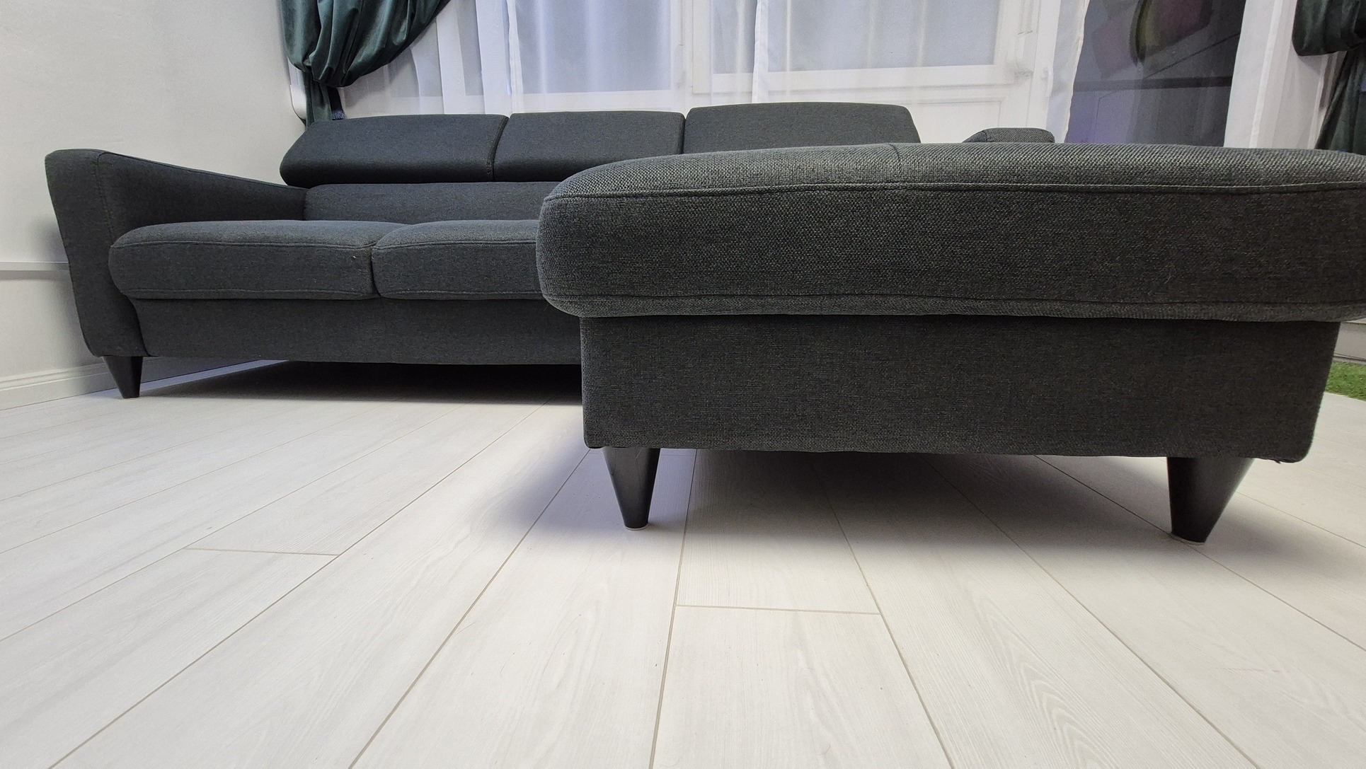 Eladó a képeken látható sötétszürke/szürkészöld szövetű, térbe helyezhető, L-alakú kanapé.