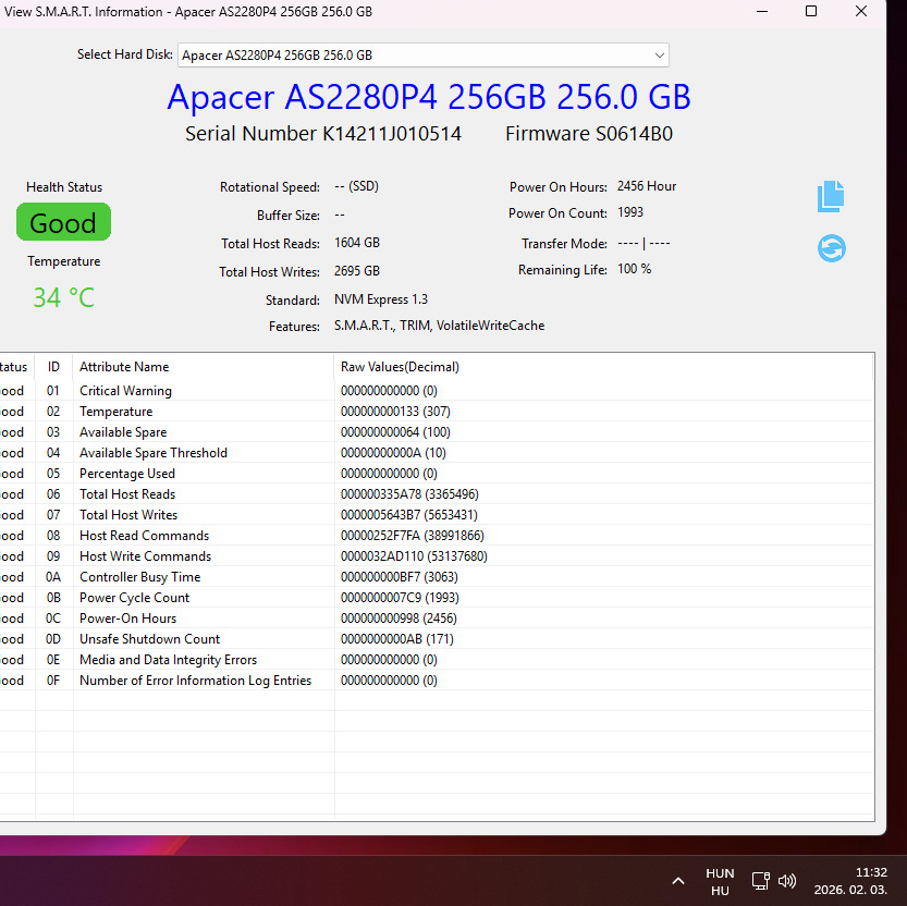 Eladó a képen látható paraméterekkel rendelkező, hibátlan SSD.