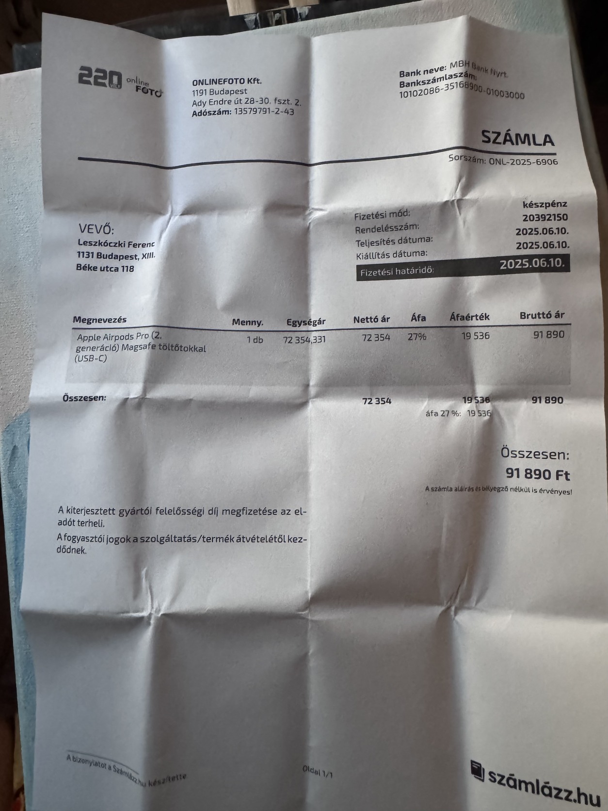 Airpods pro 2 2025.06 vásárolt (220volt webáruház számla )