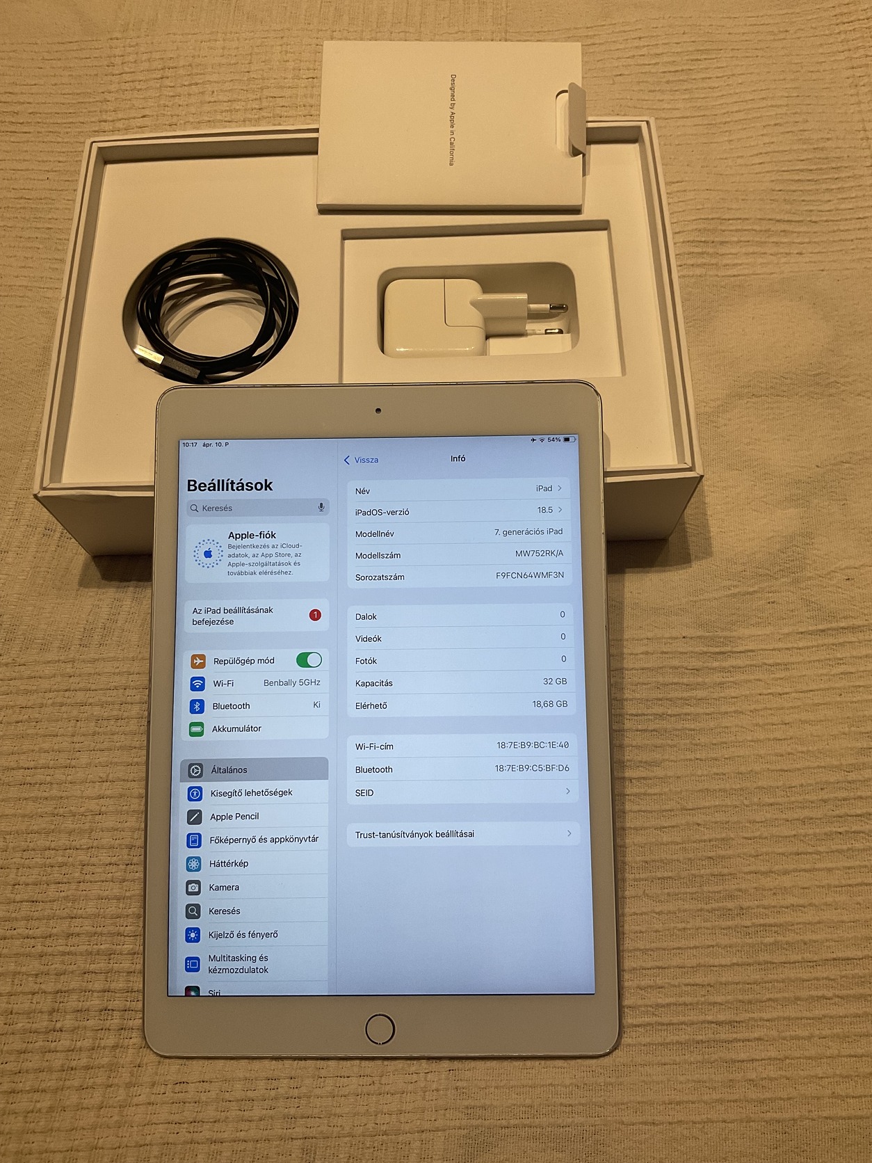 Az iPad érintőüvege cserélve volt, a fő gomb sajnos nem működik, de így is tökéletesen használható a gesztusvezérléssel. Minden más funkciója tökéletesen működik. A házon kisebb sérülés, a használatot nem befolyásolja. Akkumulátor 78%, ami úgy 7 órás üzemidőt jelent, nem kapcsol ki, töltést rendesen veszi.
