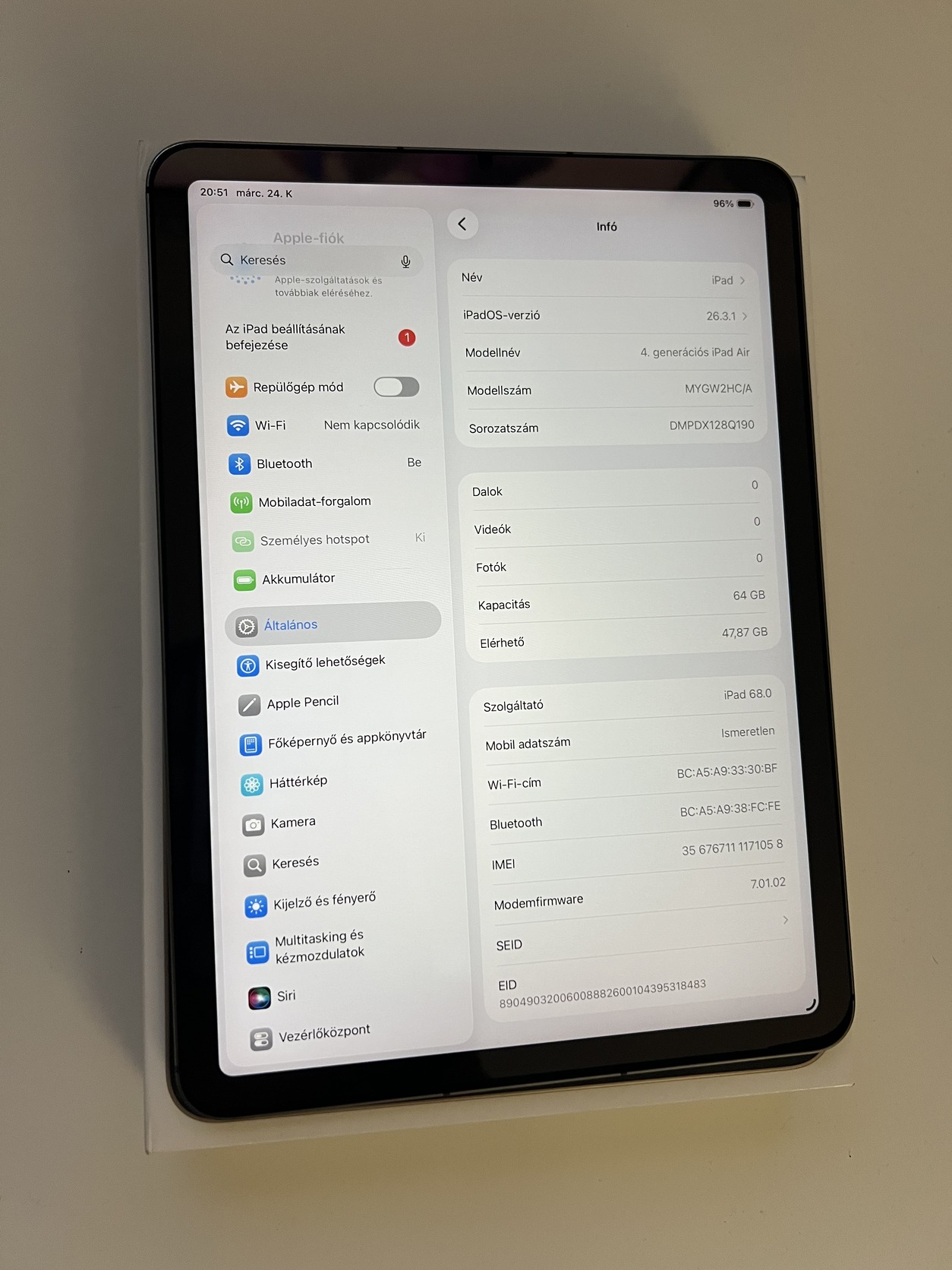 Eladó egy használt állapotban lévő Apple iPad Air 4 2020 10.9 64GB Cellular, minden funkciója tökéletesen működik.