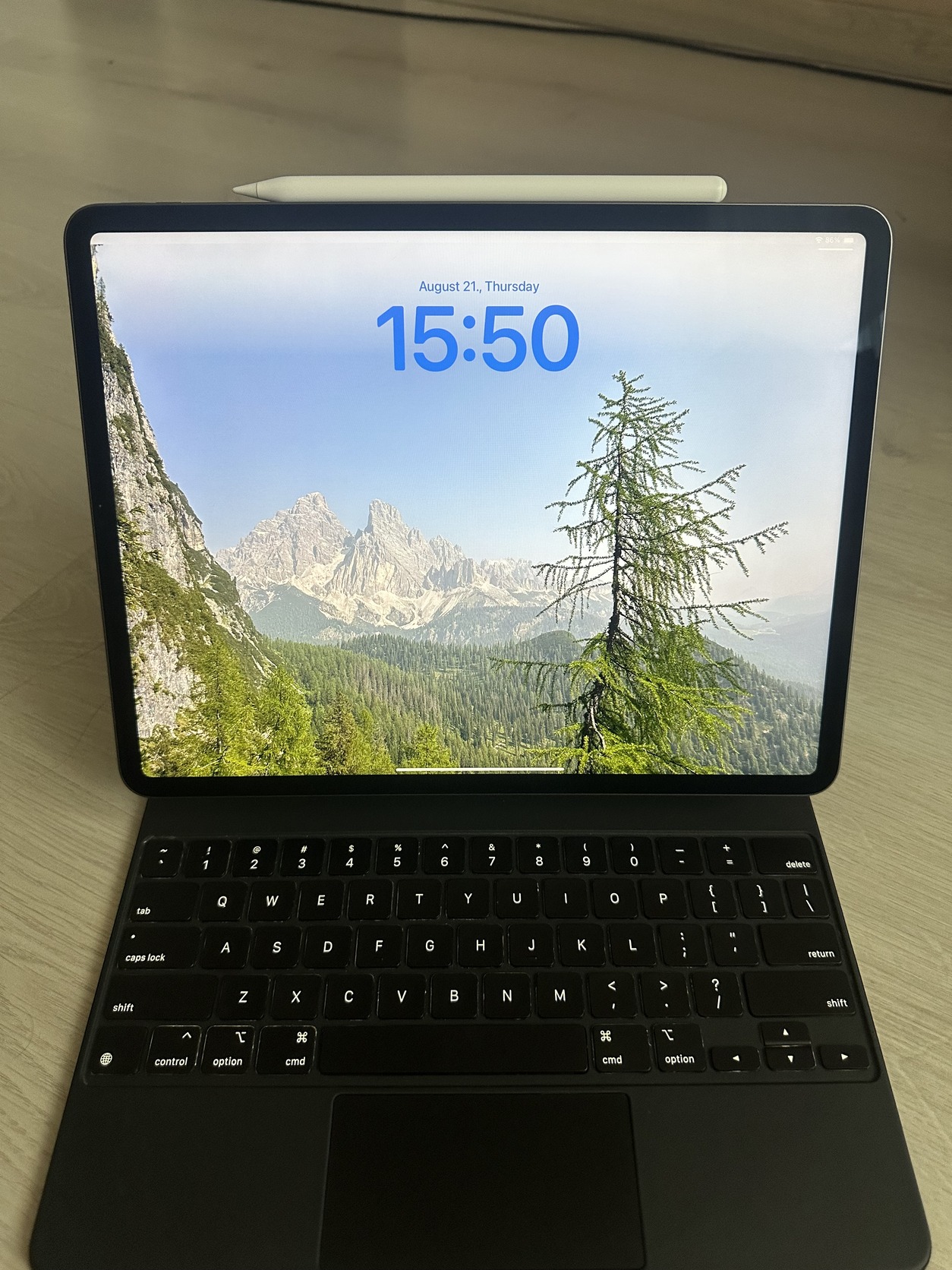 Top állapot, csak egy apró karc van a kijelző tetején, amit amúgy használat közben soha nem látsz – csak ha fényben, kikapcsolva nézed. Azóta végig Magic Keyboardban lakott. Képen próbáltam szemléltetni.